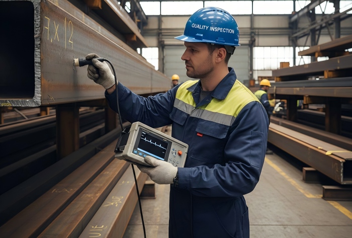 • How It Works: A trained technician uses a handheld transducer that generates high-frequency sound waves (ultrasound). These waves are coupled into the steel via a gel and travel through the material. When they encounter a discontinuity (flaw), part of the sound energy is reflected back to the transducer. The time delay and amplitude of this "echo" are analyzed to determine the flaw's depth, size, and orientation.